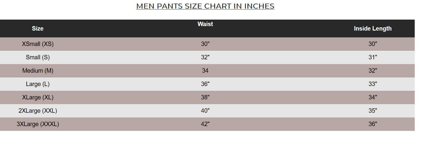 Please specify the pants size indicated in the pant size chart above when placing your order.