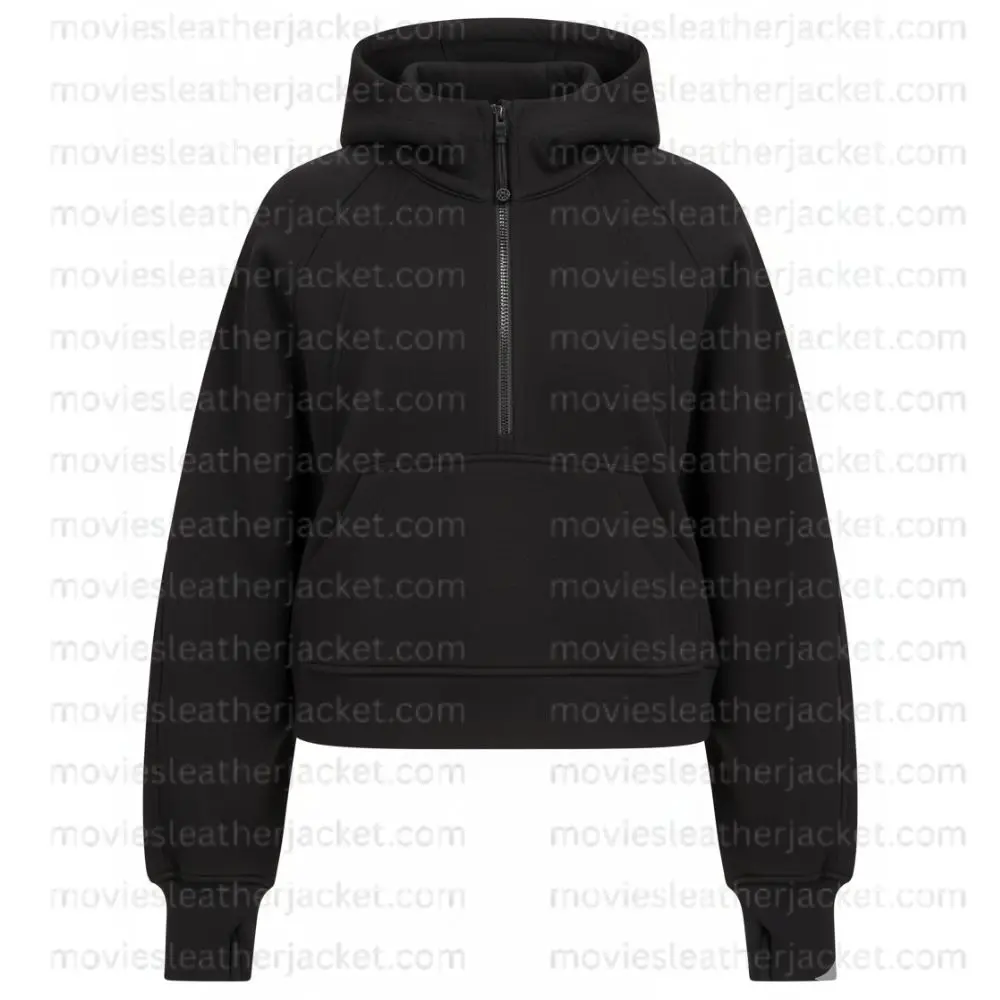 Maya’s laid back style in this black fleece pullover hoodie which features a half zip design, rib knit cuffs, and a pouch pocket. Great for casual days or travel comfort.